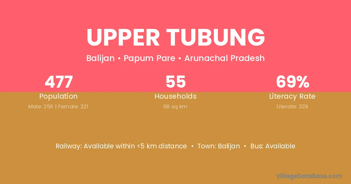 Upper Tubung village has a total population of 477 people, of which 256 are males and 221 are females.