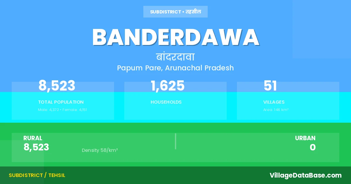 Banderdawa is a town and Circle in the Papum Pare district of the Arunachal Pradesh. In India, a Circle is a subdivision of a district responsible for the administration and revenue collection of a specific area within the district. Circles play a crucial role in the local governance structure, contributing significantly to the development and administration of their communities.