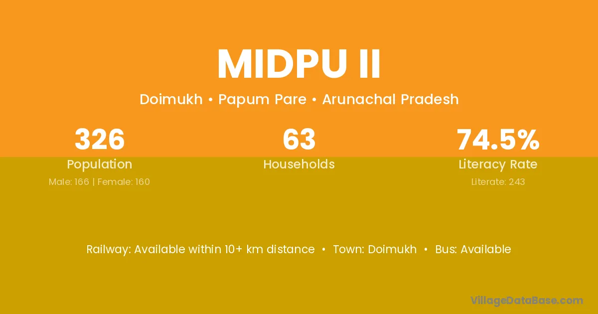 The literacy rate of Midpu Ii village is 74.54%. Male literacy stands at 75.30% and female literacy at 73.75%.