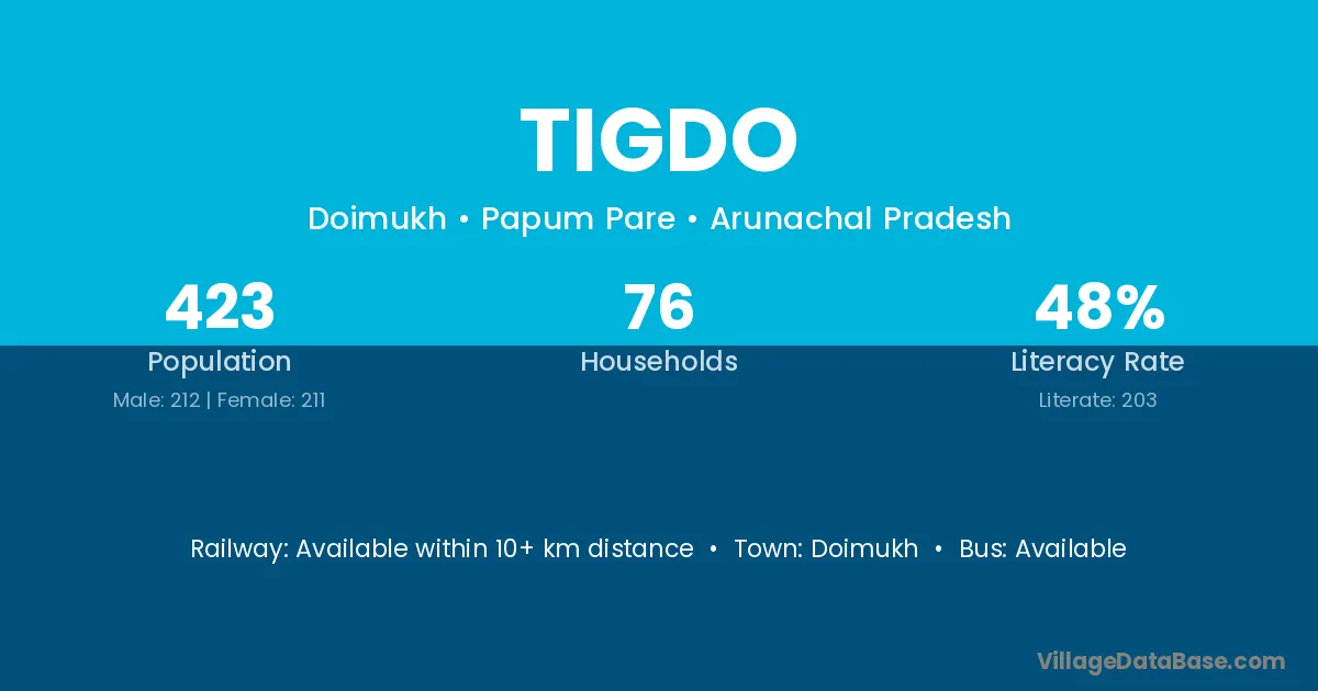 Tigdo village has a total population of 423 people, of which 212 are males and 211 are females.