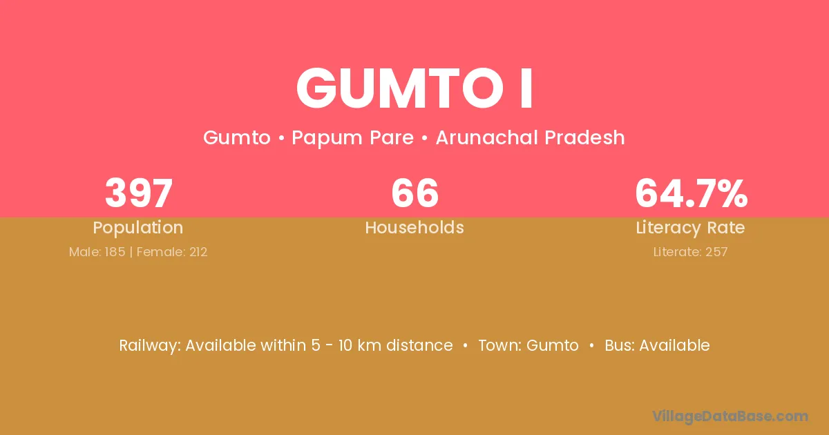 Gumto I village has a total population of 397 people, of which 185 are males and 212 are females.