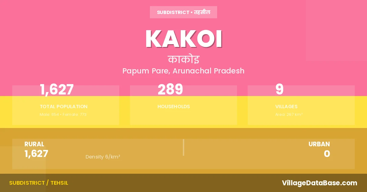 Kakoi is a town and Circle in the Papum Pare district of the Arunachal Pradesh. In India, a Circle is a subdivision of a district responsible for the administration and revenue collection of a specific area within the district. Circles play a crucial role in the local governance structure, contributing significantly to the development and administration of their communities.