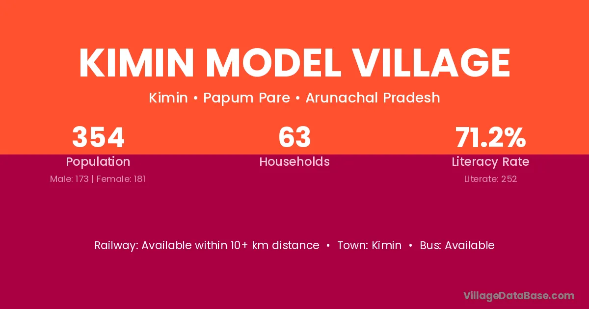 The literacy rate of Kimin Model Village village is 71.19%. Male literacy stands at 75.72% and female literacy at 66.85%.