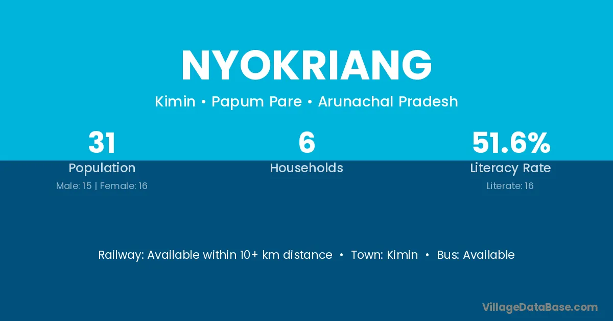 Nyokriang village has a total population of 31 people, of which 15 are males and 16 are females.