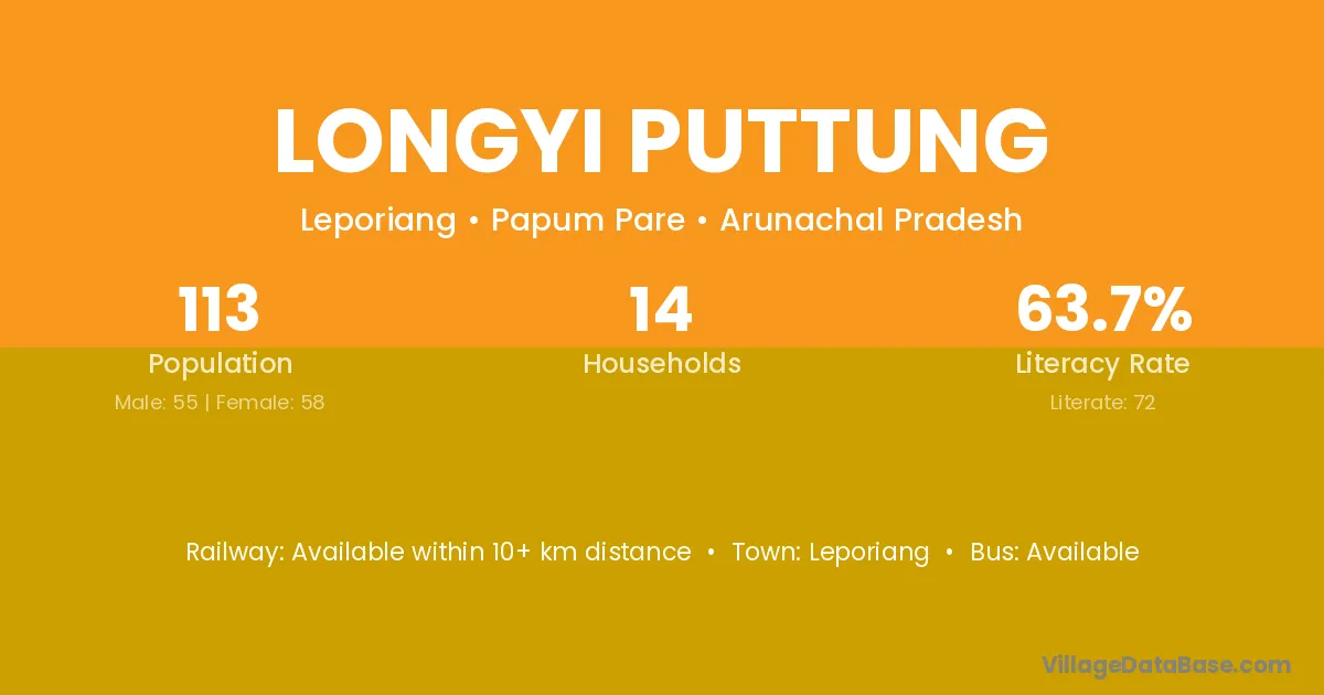 Longyi Puttung village has a total population of 113 people, of which 55 are males and 58 are females.