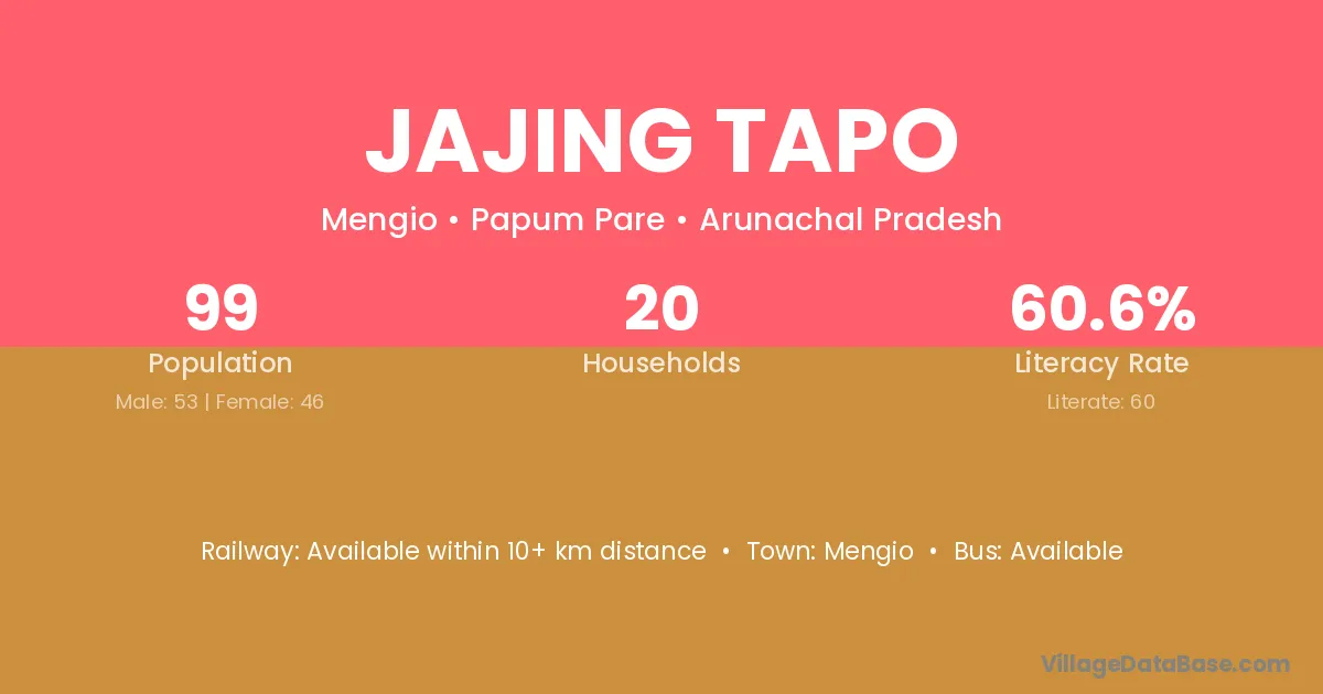 Jajing Tapo village has a total population of 99 people, of which 53 are males and 46 are females.