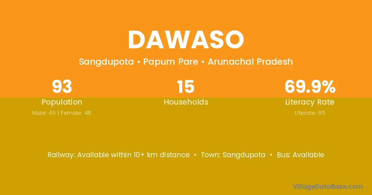 Dawaso village has a total population of 93 people, of which 45 are males and 48 are females.