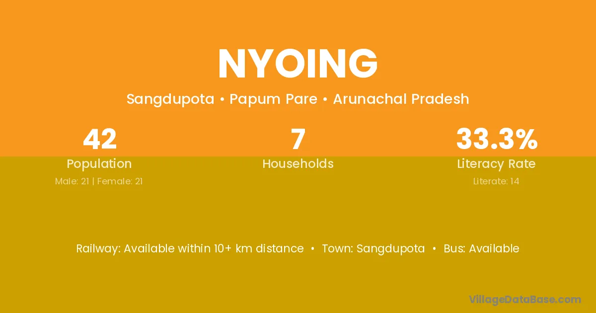 Nyoing village has a total population of 42 people, of which 21 are males and 21 are females.
