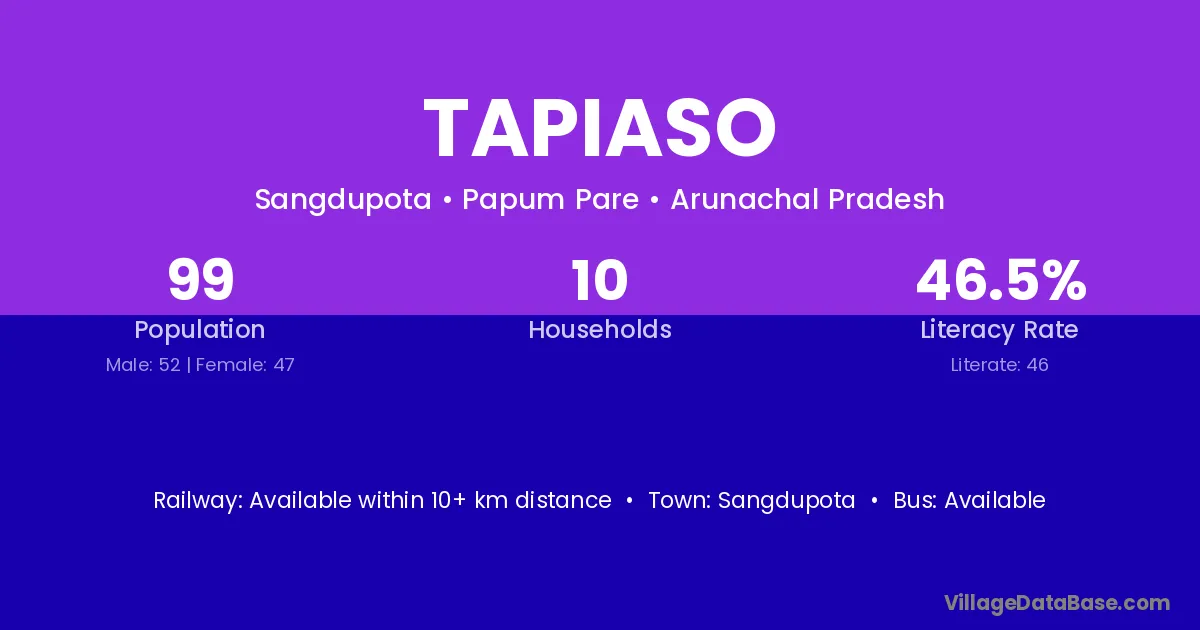 The literacy rate of Tapiaso village is 46.46%. Male literacy stands at 57.69% and female literacy at 34.04%.