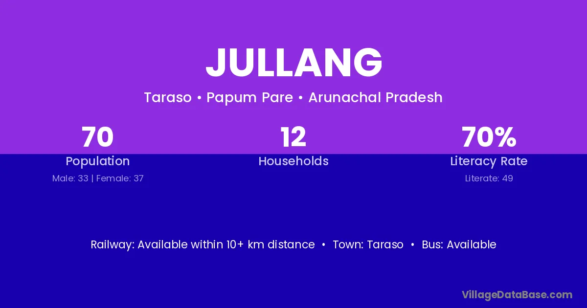 Jullang village has a total population of 70 people, of which 33 are males and 37 are females.