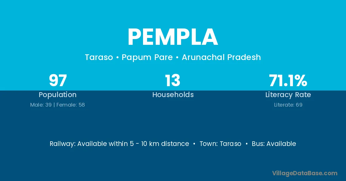 Pempla village has a total population of 97 people, of which 39 are males and 58 are females.
