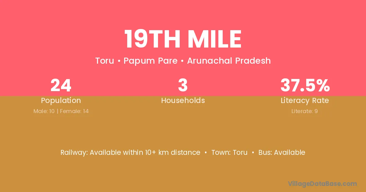 The literacy rate of 19th Mile village is 37.50%. Male literacy stands at 30.00% and female literacy at 42.86%.