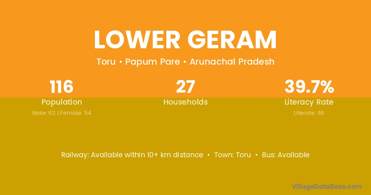 Lower Geram village has a total population of 116 people, of which 62 are males and 54 are females.