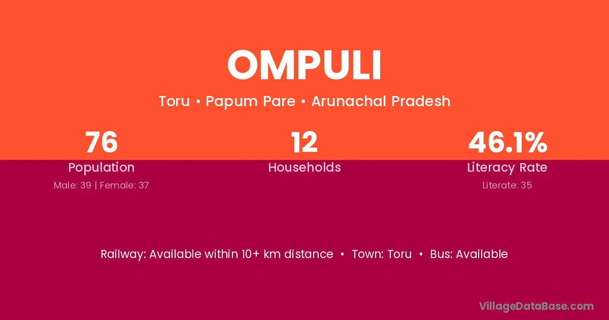Ompuli village has a total population of 76 people, of which 39 are males and 37 are females.