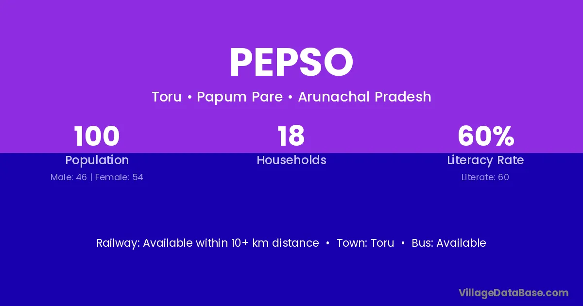 The literacy rate of Pepso village is 60.00%. Male literacy stands at 65.22% and female literacy at 55.56%.