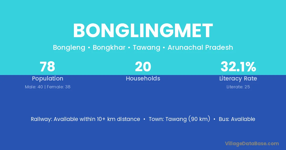 Tawang (90 km) is the nearest town to Bonglingmet village for major economic activities and is located approximately 90 km away.