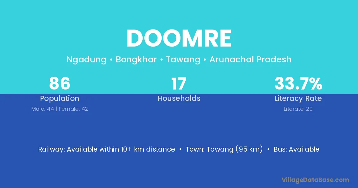 Tawang (95 km) is the nearest town to Doomre village for major economic activities and is located approximately 95 km away.