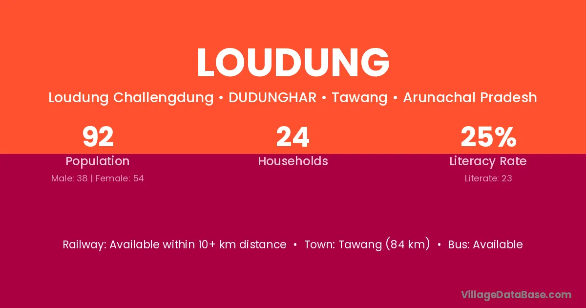 Tawang (84 km) is the nearest town to Loudung village for major economic activities and is located approximately 84 km away.