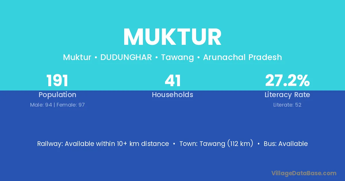 Tawang (112 km) is the nearest town to Muktur village for major economic activities and is located approximately 112 km away.