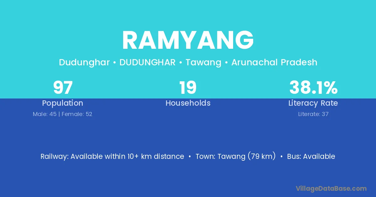 Ramyang village has a total population of 97 people, of which 45 are males and 52 are females.