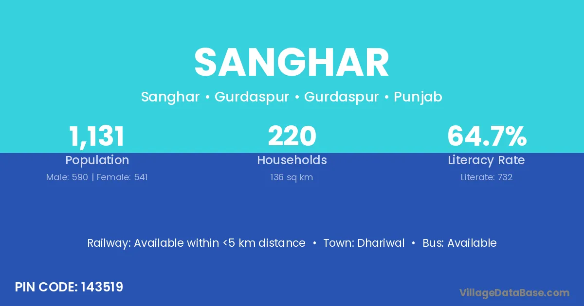 Sanghar village has a total population of 194 people, of which 93 are males and 101 are females.