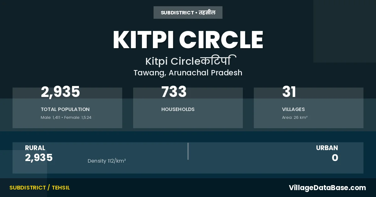 According to the 2011 census The total area of KITPI CIRCLE Circle is 26 km², with a population of 2935 people. The population density is 112 inhabitants per square kilometre, and there are approximately 733 houses in the sub district.