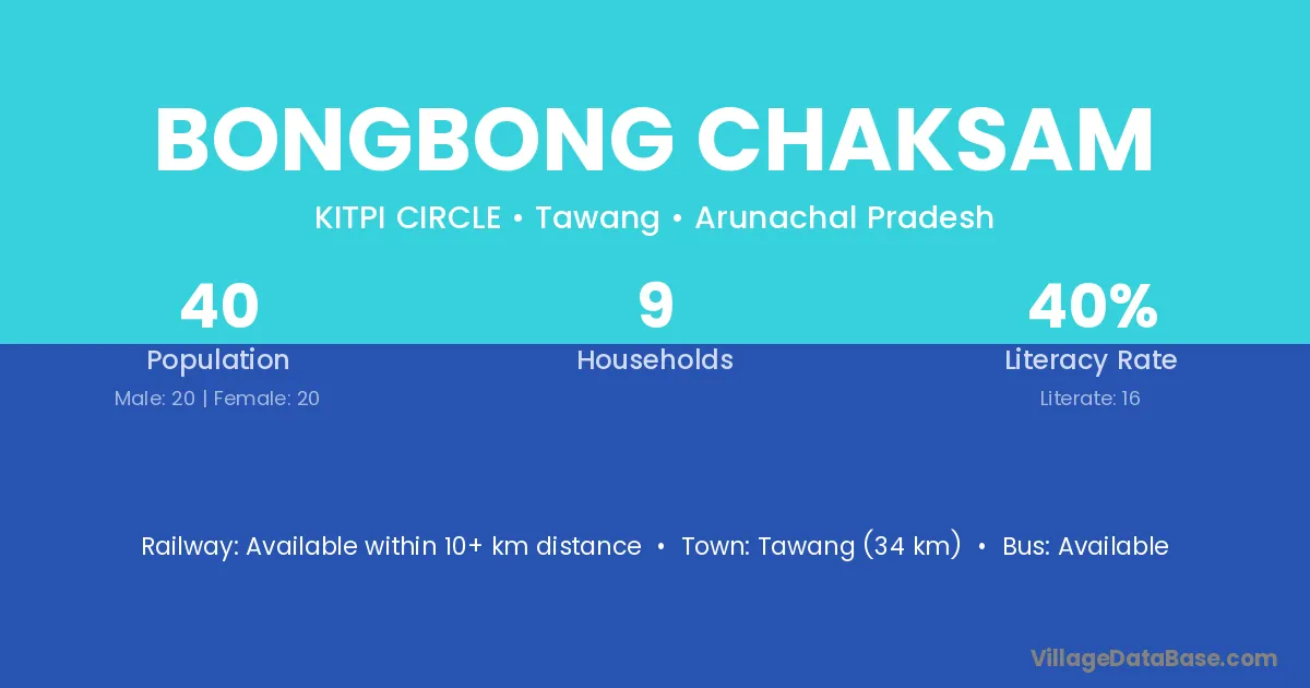 Bongbong Chaksam village has a total population of 40 people, of which 20 are males and 20 are females.