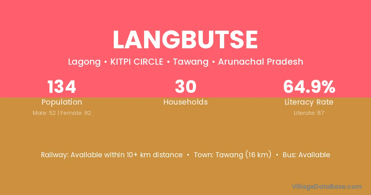Tawang (16 km) is the nearest town to Langbutse village for major economic activities and is located approximately 16 km away.