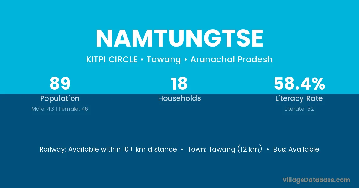 Tawang (12 km) is the nearest town to Namtungtse village for major economic activities and is located approximately 12 km away.