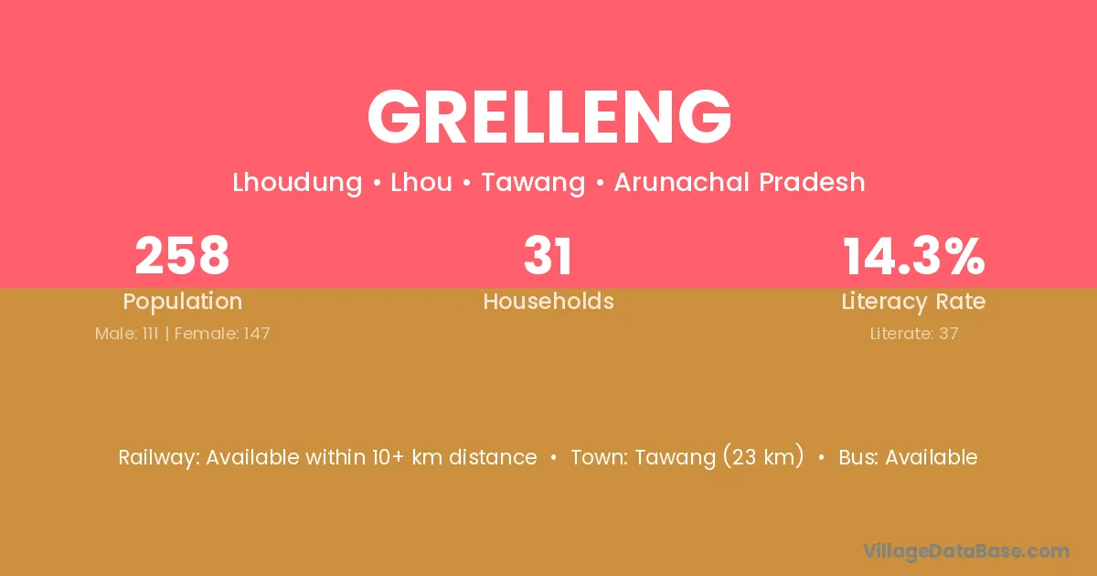 Tawang (23 km) is the nearest town to Grelleng village for major economic activities and is located approximately 23 km away.