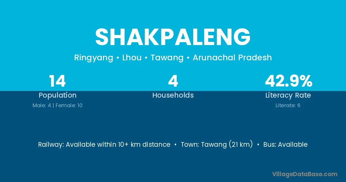 Tawang (21 km) is the nearest town to Shakpaleng village for major economic activities and is located approximately 21 km away.