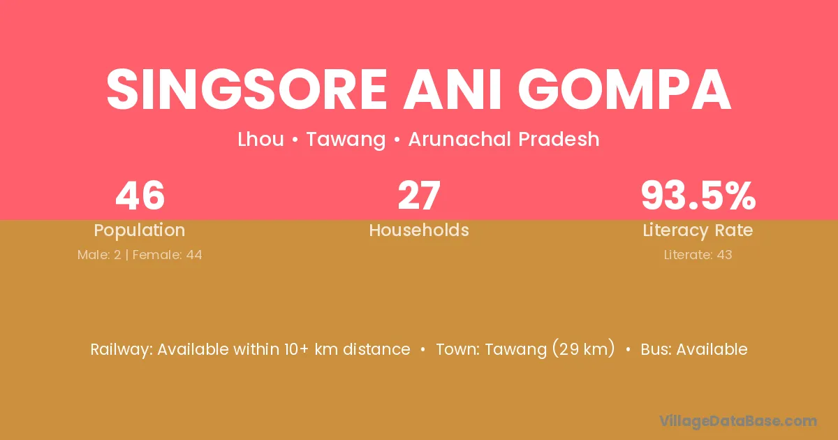 Singsore Ani Gompa village has a total population of 46 people, of which 2 are males and 44 are females.