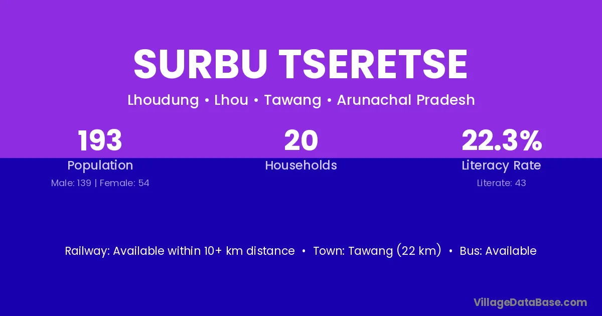 Tawang (22 km) is the nearest town to Surbu Tseretse village for major economic activities and is located approximately 22 km away.