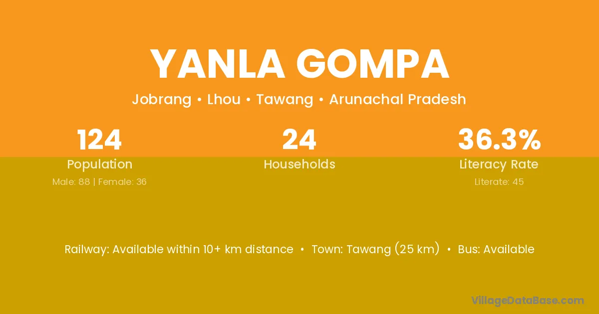 Tawang (25 km) is the nearest town to Yanla Gompa village for major economic activities and is located approximately 25 km away.