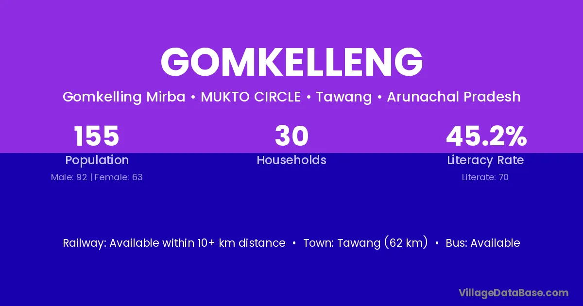 Tawang (62 km) is the nearest town to Gomkelleng village for major economic activities and is located approximately 62 km away.