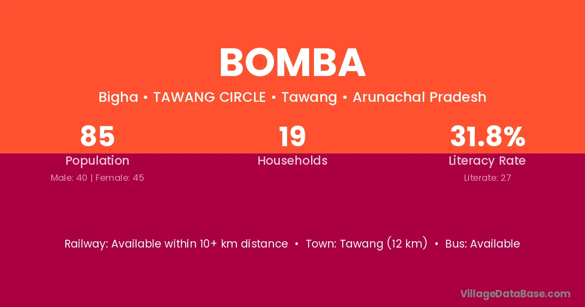 Tawang (12 km) is the nearest town to Bomba village for major economic activities and is located approximately 12 km away.