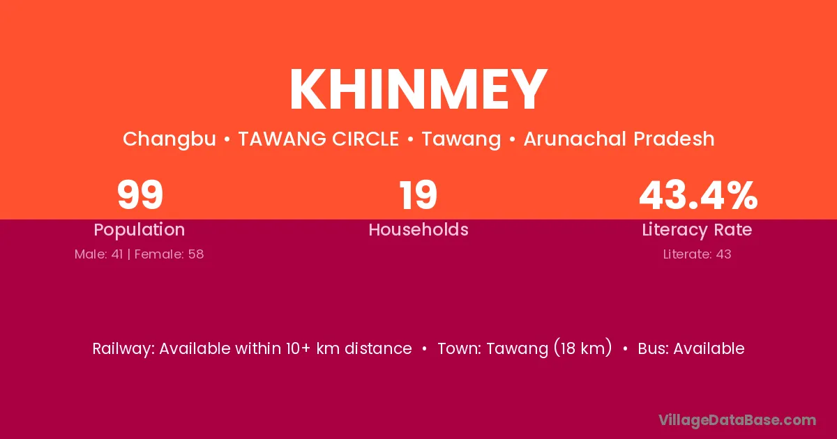 Khinmey village has a total population of 99 people, of which 41 are males and 58 are females.