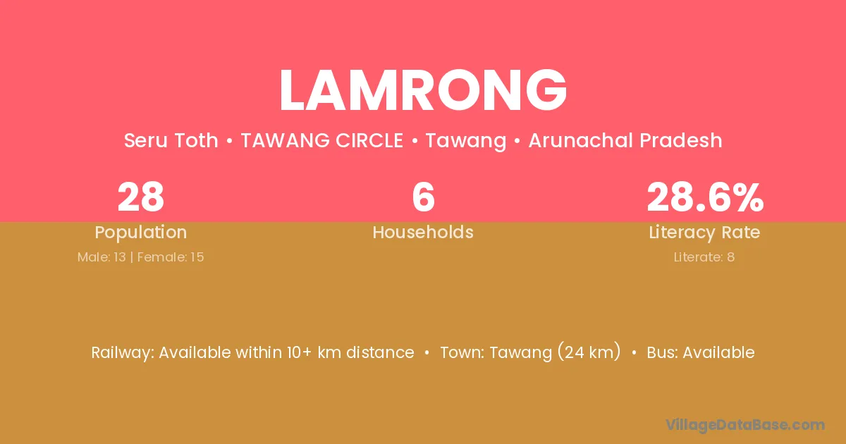 Tawang (24 km) is the nearest town to Lamrong village for major economic activities and is located approximately 24 km away.