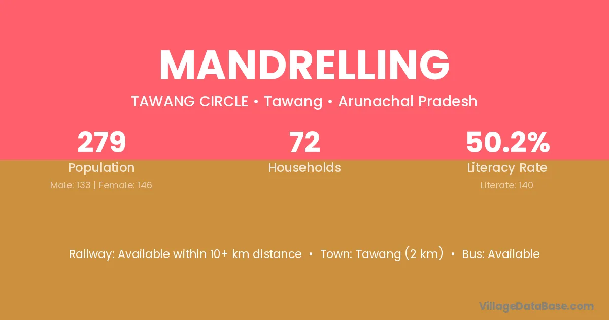 Tawang (2 km) is the nearest town to Mandrelling village for major economic activities and is located approximately 2 km away.