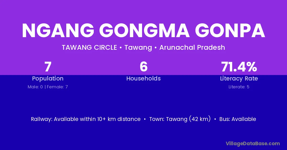 Tawang (42 km) is the nearest town to Ngang Gongma Gonpa village for major economic activities and is located approximately 42 km away.
