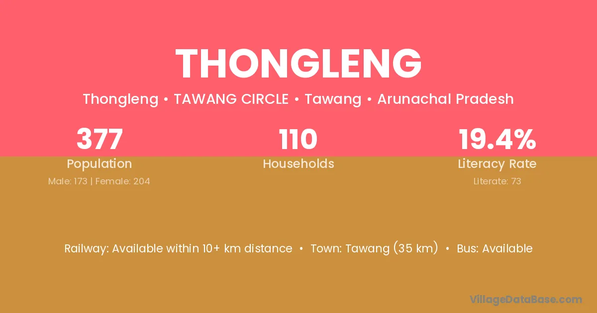 Tawang (35 km) is the nearest town to Thongleng village for major economic activities and is located approximately 35 km away.