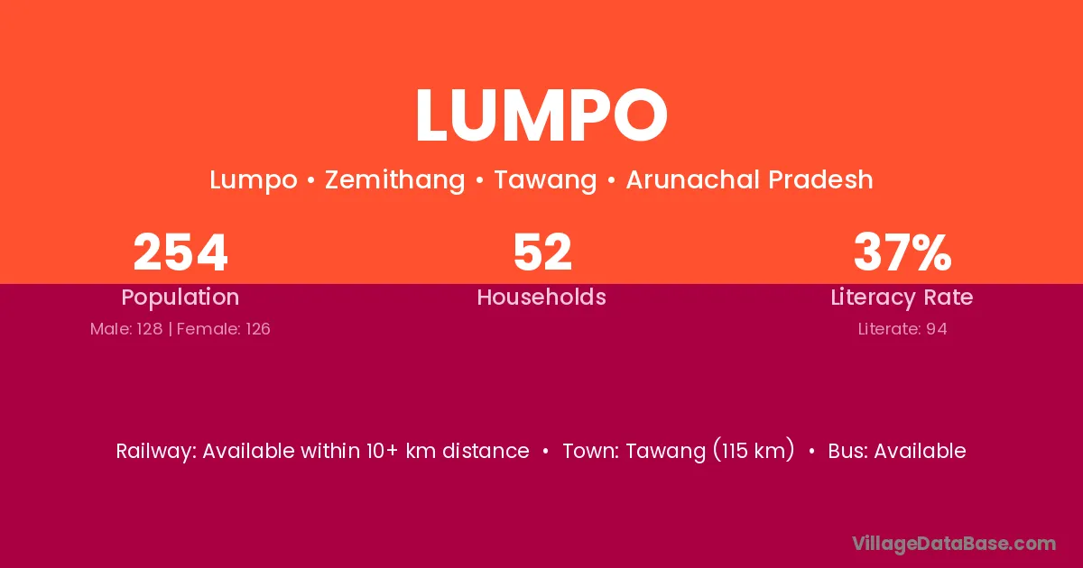 Tawang (115 km) is the nearest town to Lumpo village for major economic activities and is located approximately 115 km away.