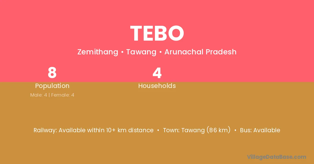 Tawang (86 km) is the nearest town to Tebo village for major economic activities and is located approximately 86 km away.