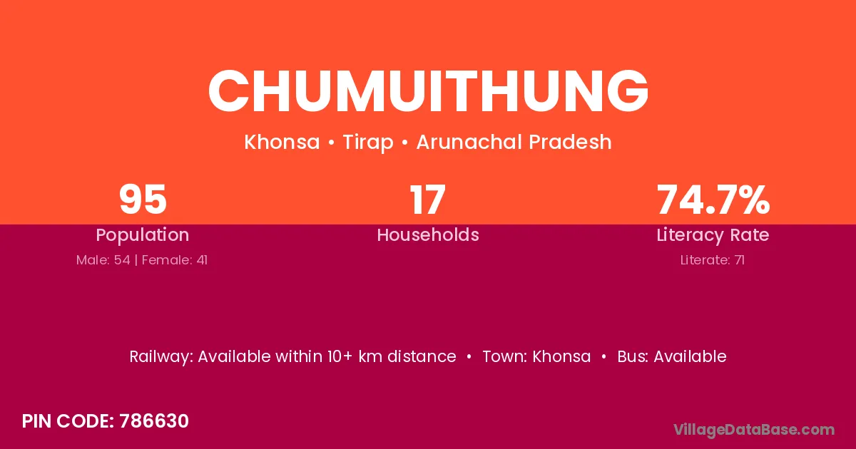 Chumuithung village has a total population of 95 people, of which 54 are males and 41 are females.