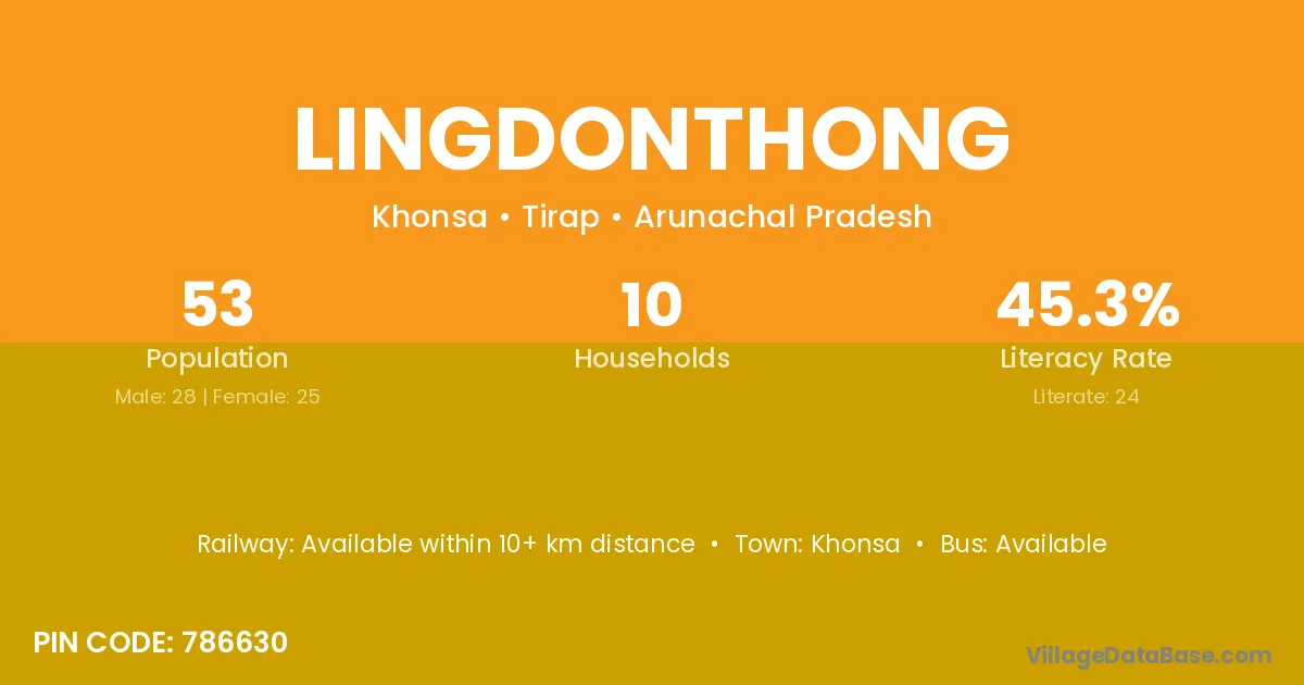 Lingdonthong village has a total population of 53 people, of which 28 are males and 25 are females.