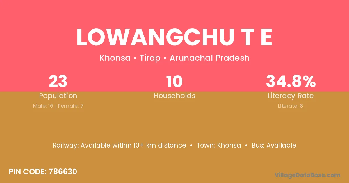 The literacy rate of Lowangchu T E village is 34.78%. Male literacy stands at 50.00% and female literacy at 0.00%.