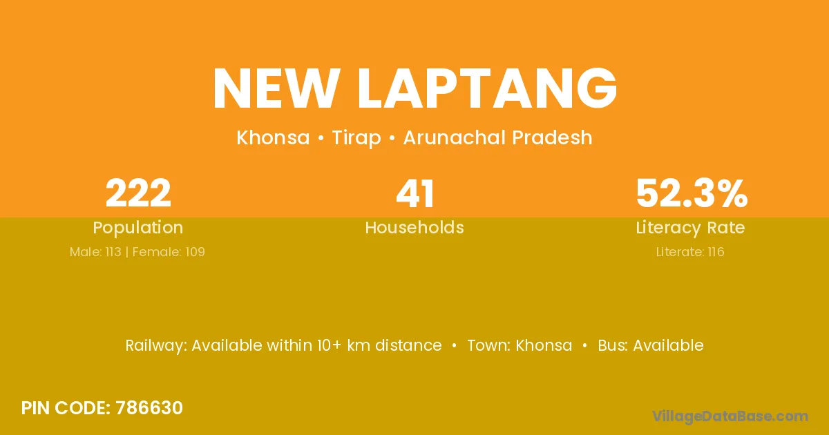 New Laptang village has a total population of 222 people, of which 113 are males and 109 are females.