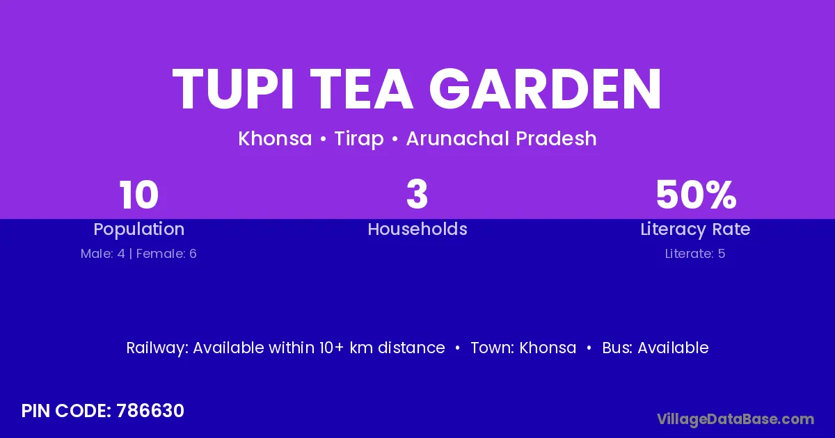 The literacy rate of Tupi Tea Garden village is 50.00%. Male literacy stands at 100.00% and female literacy at 16.67%.