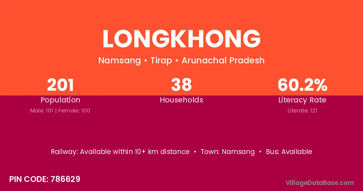 Longkhong village has a total population of 201 people, of which 101 are males and 100 are females.