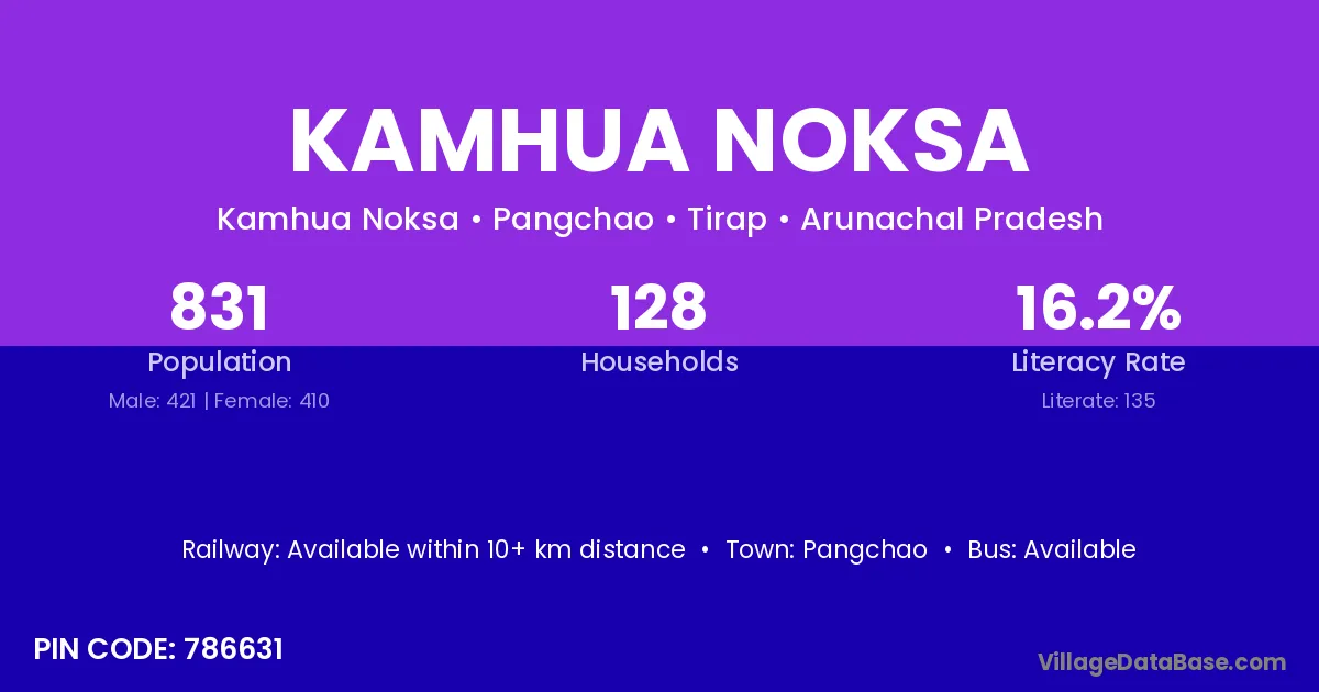 The literacy rate of Kamhua Noksa village is 16.25%. Male literacy stands at 26.37% and female literacy at 5.85%.